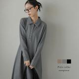 10/14 23:59まで【クーポン利用で3500円】ポロ襟 リブ カットソー ワンピース 長袖 着痩せ スタイルアップ シンプル ラクチン ロングスカート レデ...