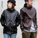 ブルゾン フェイクレザー レディース メンズ ライダース パーカー 軽い 暖かい ハイネック フード YKK PUレザー 袖リブ バイク アウター レザー ジ...