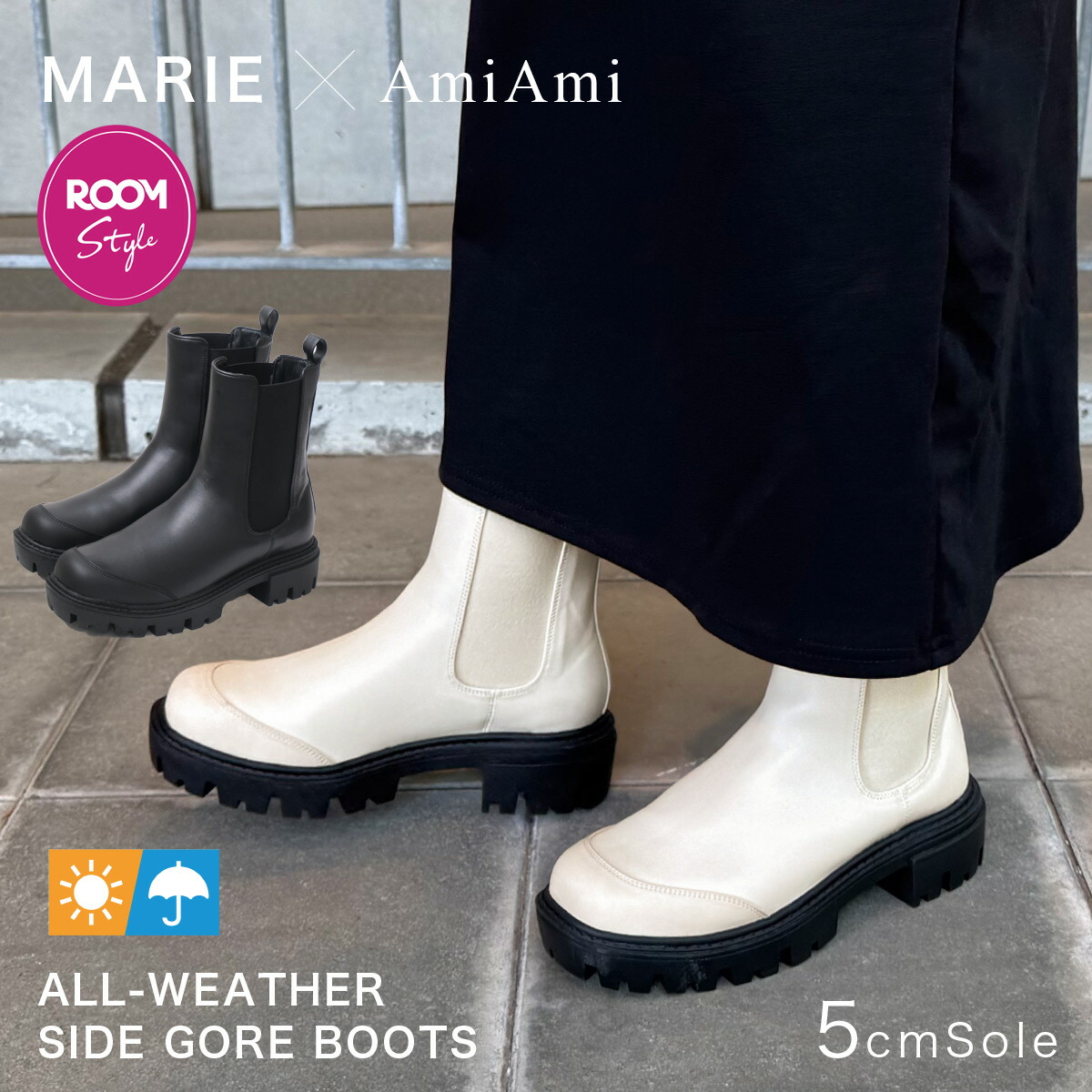 【MARIE×AmiAmi】ROOMコラボ オールウェザーサイドゴアブーツ 晴雨兼用 生活防水 5センチヒール 疲れない 履きやすい 歩きやすい レディース 雨晴れ兼用 梅雨 ブラック ホワイト 22.5 24.5 太ヒール 滑らない サイドゴア ショート 通勤