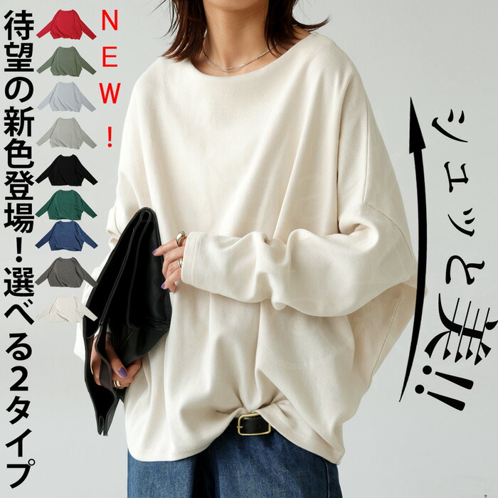 トップス 長袖 ドルマン 変形 ボートネック Vネック 綿混 無地 リブ ストレッチ プルオーバー ゆったり タイプ展開 コクーントップス 体型カバー ラクしてキレイ 大きめ