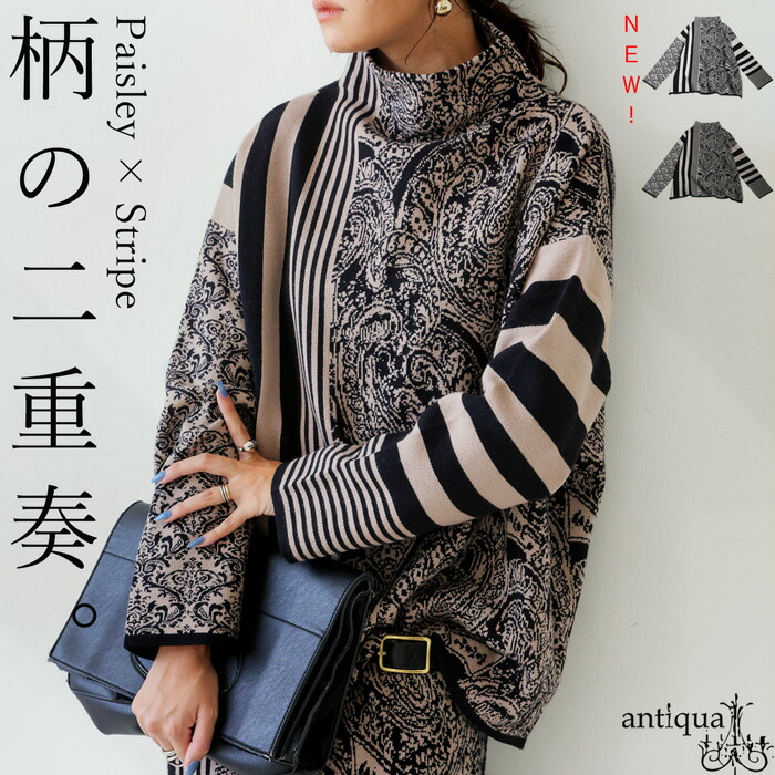 ニット プルオーバー トップス ハイネック アシンメトリー アシメ ペイズリー ストライプ ダマスク 柄 切替え きれいめ セーター 柄ニット ゆったり セットアップ