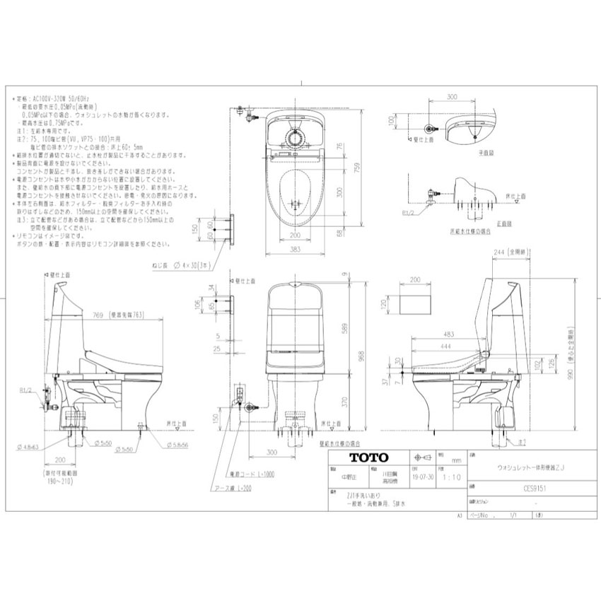 《あす楽対応》【在庫あり】 TOTO CES9151 手洗有 一体型トイレZJ1 新築用 床排水 排水芯200mm 標準配管