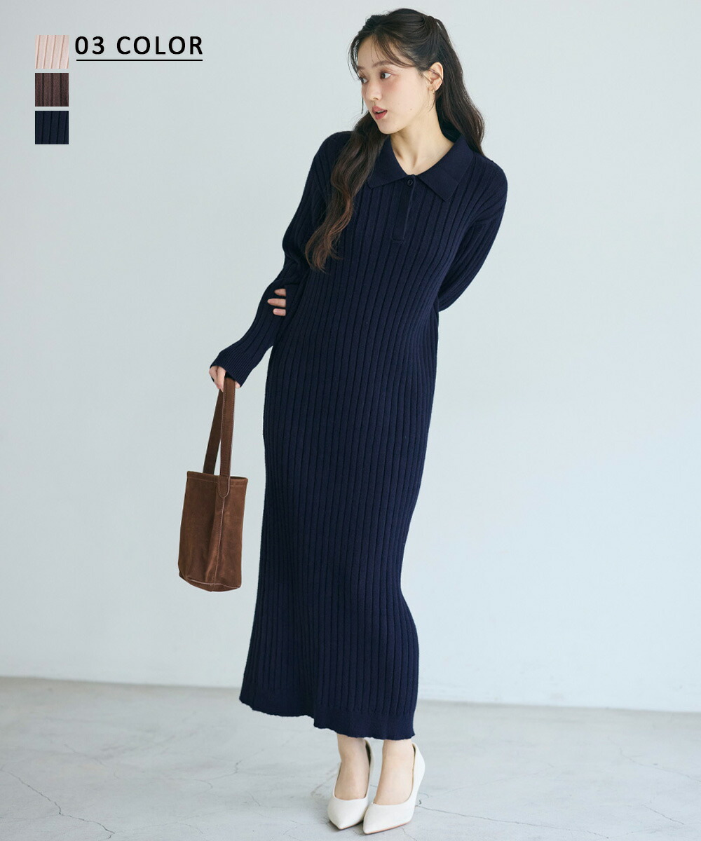 衿付きリブワンピース | レディース ワンピース 小さいサイズ フリーサイズ ワンピ 襟付き ロングワンピ マタニティ 秋 冬 マキシ 大きいサイズ 【宅配便】 (一部予約11月16日~20日以内順次発送)
