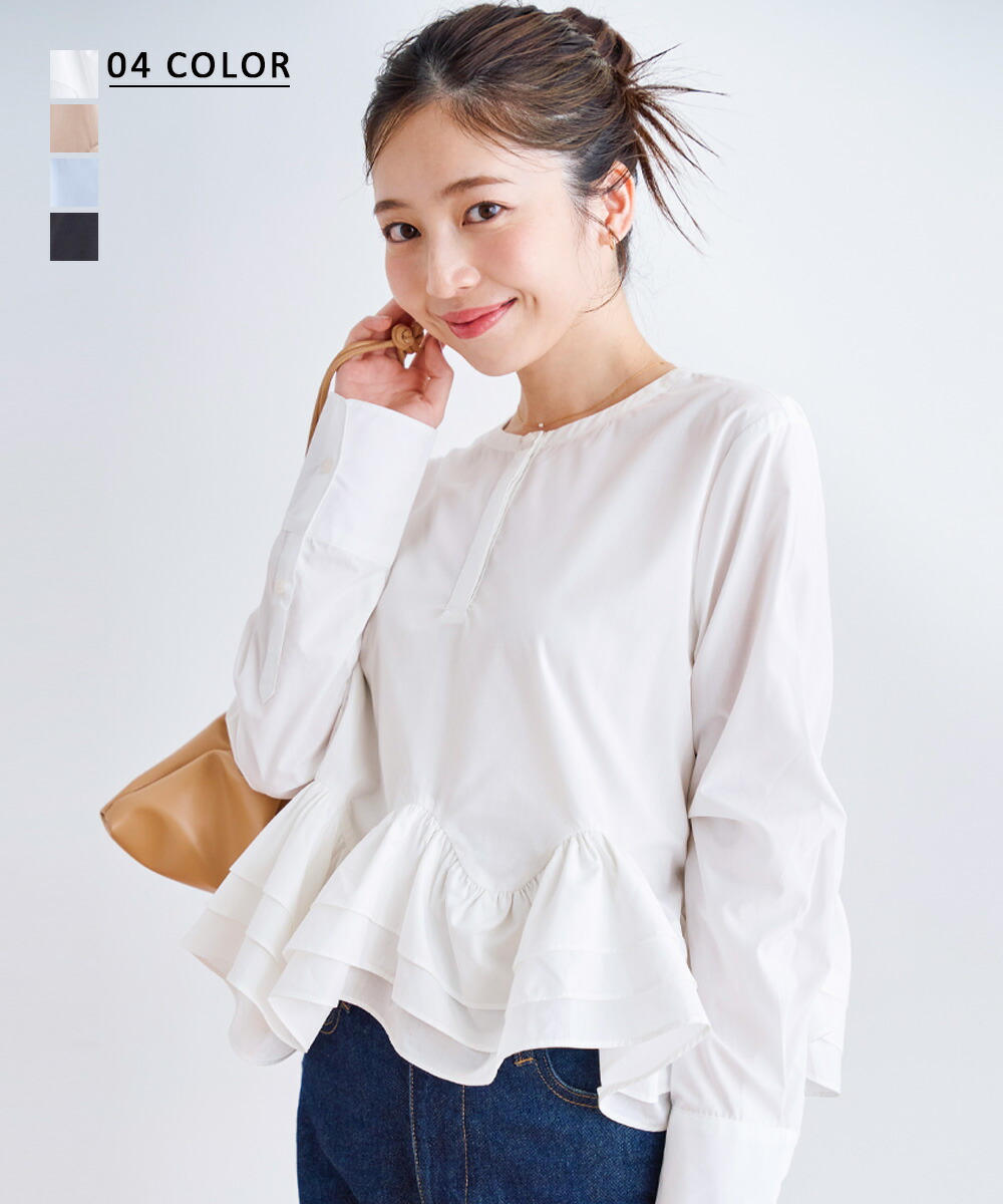 ティアードフリルブラウス |ブラウス トップス フレア フリル フリルブラウス 重ね着 ベーシック 長袖 レイヤード 日焼け対策 冷房対策 ダブルカラー カラーブラウス 【宅配便】(予約9月21日~25日以内順次発送)