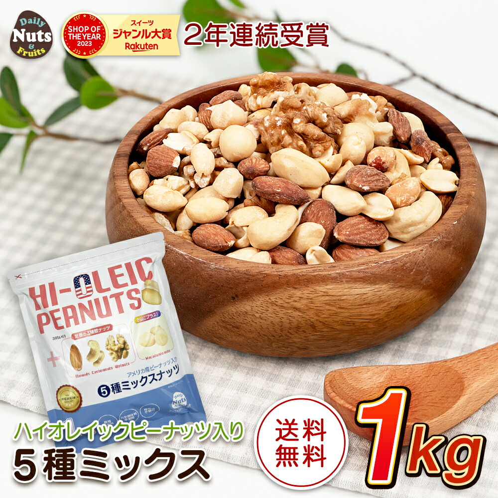 アメリカ産ピーナッツ入り5種ミックスナッツ 1kg ハイオレイックピーナッツ アーモンド 生くるみ カシューナッツ マカダミアナッツ 落花生 素焼き 無塩 たんぱく質 オメガ3脂肪酸 食物繊維 ポリフェノール ミネラル ハイオレイン 添加物不使用 おつまみ おやつ チャック付き