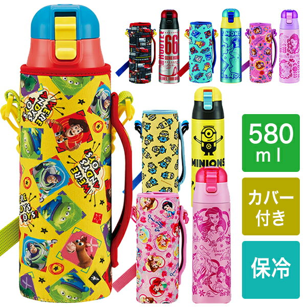 【送料無料】ボトルカバーつきで便利な超軽量コンパクトロック付水筒 ワンプッシュでフタがオープン 直飲みダイレクトボトル 580ml KSDC6 ウエット生地の水筒カバーつきでおでかけにピッタリ♪人気キャラ ディズニープリンセス ソフィア ハローキティ ミニオンズなど