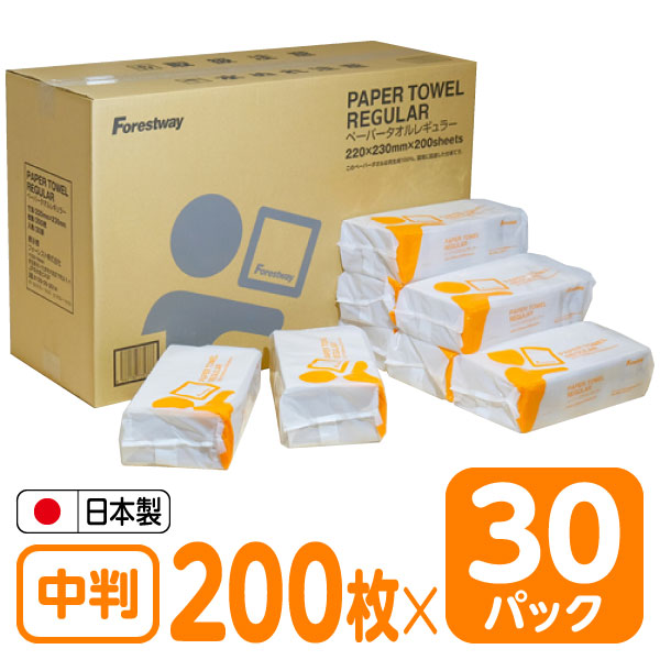 【目玉商品!楽天最安値に挑戦!】送料無料 ペーパータオル レギュラー 200枚×30パック Forestway 大容量 ペーパーハンドタオル タオルペーパー 手拭きペーパー トイレ 手拭き ペーパー 洗面所 キッチン まとめ買い 箱買い 業務用 日本製 厚手 中判 ペーパータオル