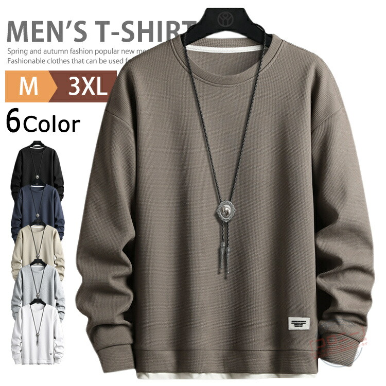 【2点で送料無料】ワッフル ロンT メンズ プルオーバー 長袖Tシャツ 裏起毛 無地 tシャツ カジュアル クルーネック ルームウェア パジャマ 重ね着風 Tシャツ ロングTシャツ ティーシャツ トップス おしゃれ 薄手 トレーナー 春 春服 秋 秋服 ユニセックス 男女兼用 父の日