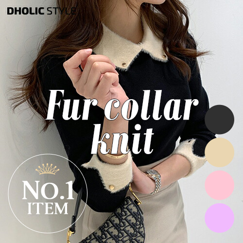 【マラソンSALE】【送料無料】kn レディース kn 韓国ファッション トップス ニット 中袖 ファーカラー 襟 スリム 細身 配色 大人 シック 高見え 高級感 上品 フェミニン お出かけ オシャレ デート 春 秋 冬 SSMINA mrt1