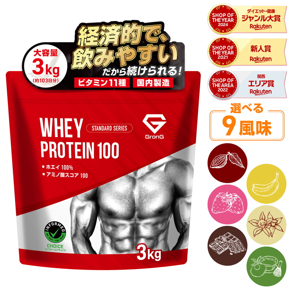 【14日10時〜ポイント5倍】グロング プロテイン ホエイプロテイン 3kg スタンダード 風味付き ナチュラル ビタミン11種配合 GronG 置き換え ダイエット タンパク質 サプリメント アミノ酸スコア100 美味しい 送料無料 ポイント