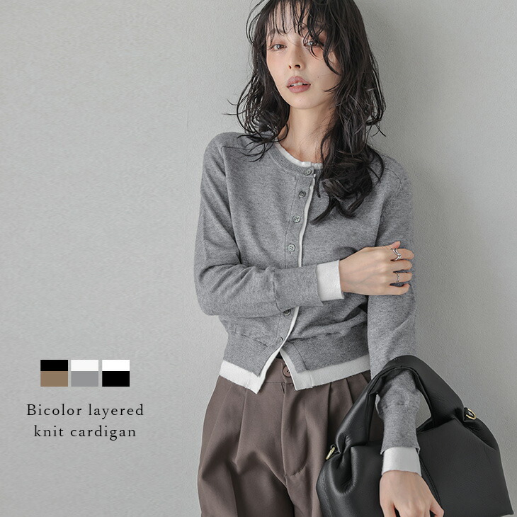 10/12 23:59まで【クーポンで2,500円】レイヤード カーディガン ニット バイカラー 重ね着風 シンプル 無地 クルーネック 着痩せ ミディアム トップス レディース おしゃれ 2025秋冬新作 【lstpaw25-1608】【予約販売:10月30日入荷予定順次発送】【送料無料】メ込2