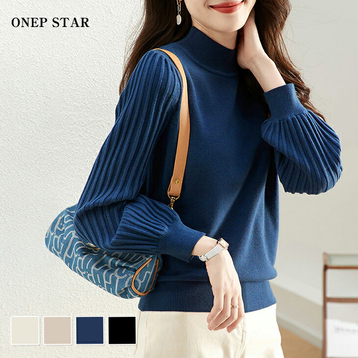 【2,580円→2,345円!】プリーツスリーブハイネックニット レディース トップス 長袖 リブ ニットモックネック プリーツスリーブ ぽわん袖 ハイネック 二の腕カバー プルオーバー20代 30代 40代 50代 ワンピスター