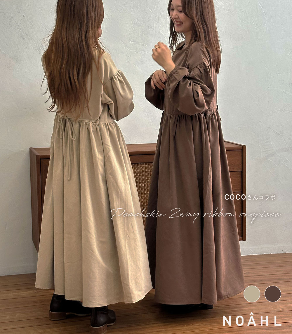 NOAHL|《4,940円→50%0FFクーポン利用》リニューアル&新色《cocoさんコラボ》ピーチスキン ワンピース レディース 2way ロングワンピース フレア リボン ギャザー フレワンピース ボタン グレージュ ブラウン 240930 251022