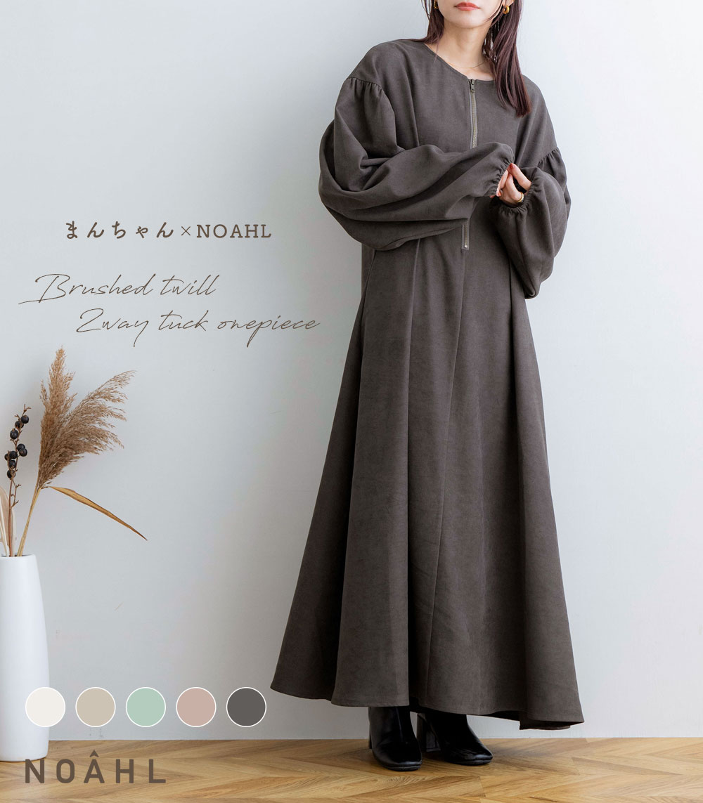 NOAHL|《5,500円→1,000円クーポン利用》《まんちゃんコラボ》 起毛ツイル 2way タックワンピース レディース ワンピース スカート ツイル ベージュ ミント ピンク グレージュ チャコール 241017 251015【一部予約】