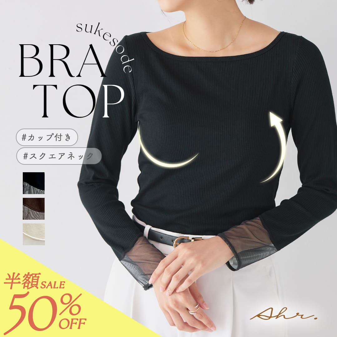 \半額!50%OFF/カップ付き トップス スクエアネック アール ブラトップ/sukesode ロンt 袖シアー切替 シアートップス 長袖 カップ付きインナー カップ付きtシャツ タンクトップ ナイトブラ ルームウェア レディース 補正 ラディアンヌ