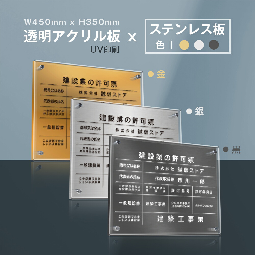 \クーポン配布中♪/建設業の許可票 看板 W45cm×H35cm 【透明アクリル板×ステンレス板】標識 短納期 文字入れ無料 js-26