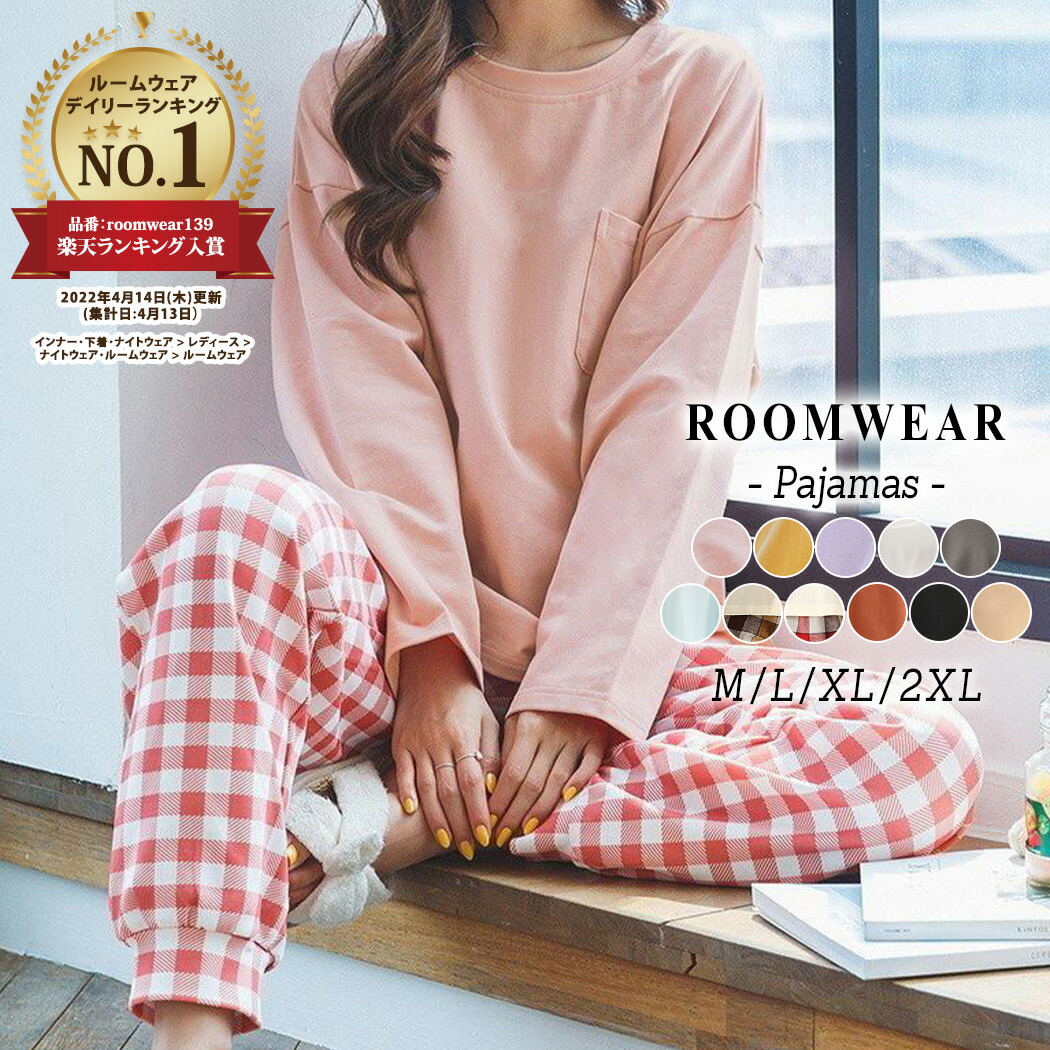 無地×チェックでコーデが決まる♪別の服と組み合わせOKなのも◎ ナイトウェア おうち時間 春秋 カフスパンツ ギンガムチェック オーバーチェック風 ミックスマッチ 泊まり